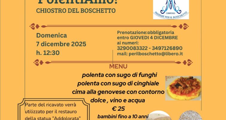 Organizzato dall’ Associazione “Insieme per il Boschetto” si terrà DOMENICA 7 DICEMBRE p.v. alle 12.30 una “Polentata nel Chiostro”. Per partecipare all’ iniziativa che si terrà al chiuso, quindi al Continue Reading →